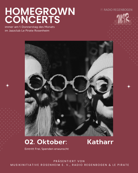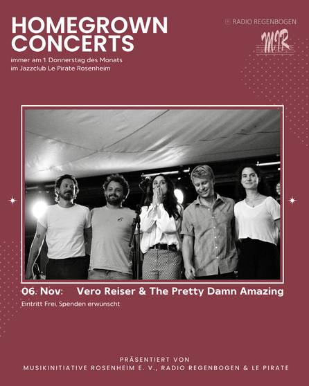 Die Homegrown Konzert Reihe wird von uns, der Musikinitiative Rosenheim zusammen mit Radio Regenbogen und dem Jazzclub Le Pirate präsentiert und soll MusikerInnen aus der Region eine regelmäßige Plattform und dem Publikum einen schönen Abend bieten.